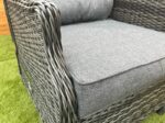 Care is straightforward. All you need to do is store the cushions away when you’re not using them and keep them indoors over winter. They’re not waterproof by design because non-waterproof cushions feel better for sitting, don’t develop that clammy feel, and the coating on waterproof styles can crack after a couple of summers in UV. The covers come off for a 30°C machine wash, and the frame and rattan just need a damp cloth or a quick rinse with the hose.