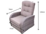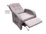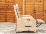 Two reclining rocking armchairs, built-in footrests, and a footprint of 90cm x 230cm — a bistro set for people who’d rather properly relax than sit bolt-upright. Each chair has a backrest adjustment lever on the right arm, plus a separate side lever to raise the footrest, so you can eat, read, or rest back without moving to a different chair. That’s the point of a reclining garden set: standard chairs keep you upright, and these let you find the angle that suits you.
