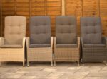 Four reclining dining chairs, one 110cm round table, and a better way to sit outside. This set is for people who’ve had enough of rigid garden chairs that feel fine for twenty minutes and then start punishing your back. With side-handle reclining backs on every chair, you can sit up to eat, lean back to read, and go a bit further when the afternoon turns into a nap. Nobody ever falls asleep bolt-upright.