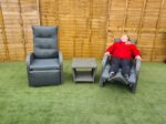 Two reclining chairs, a compact glass-topped table, and a built-in footrest that moves with the backrest — this bistro set is made for proper comfort in a small outdoor space. Standard garden chairs keep you sitting upright whether you’re having a quick coffee or reading for an hour. These don’t. Use the side handle on each chair and lean back to the angle that suits you, so you can eat, read, or take a proper rest without perching bolt-upright.